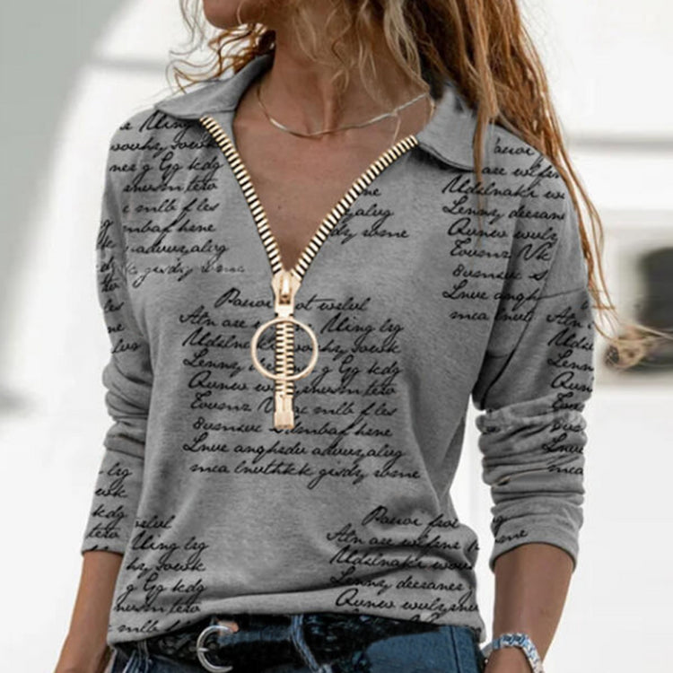 Printed Zipper V-Neck Long-Sleeved T-Shirt Women