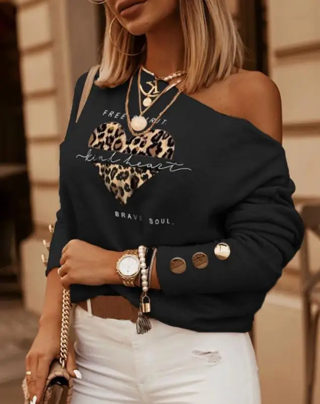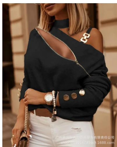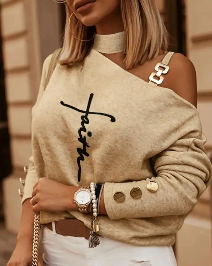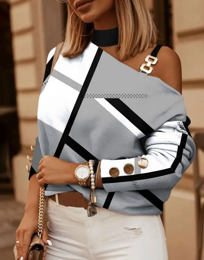 Fashion Woman Blouses 2022 Autumn Marble Print Metal Decor Casual Cold Shoulder Diagonal Collar Long Sleeve Daily Tee Top