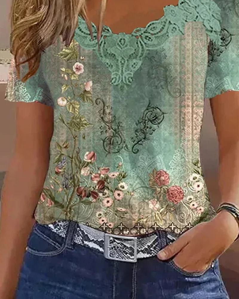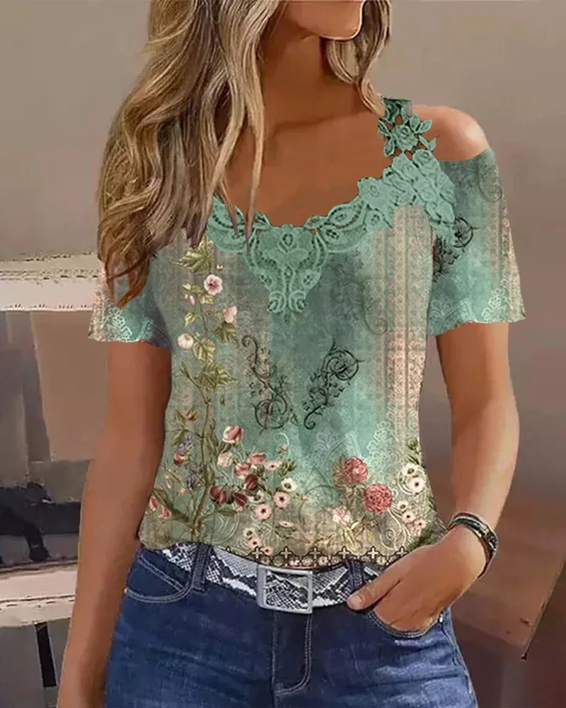 Floral Tribal Print Cold Shoulder Top Women Short Sleeve Summer Spring T Shirt Tops Blouse V Neck