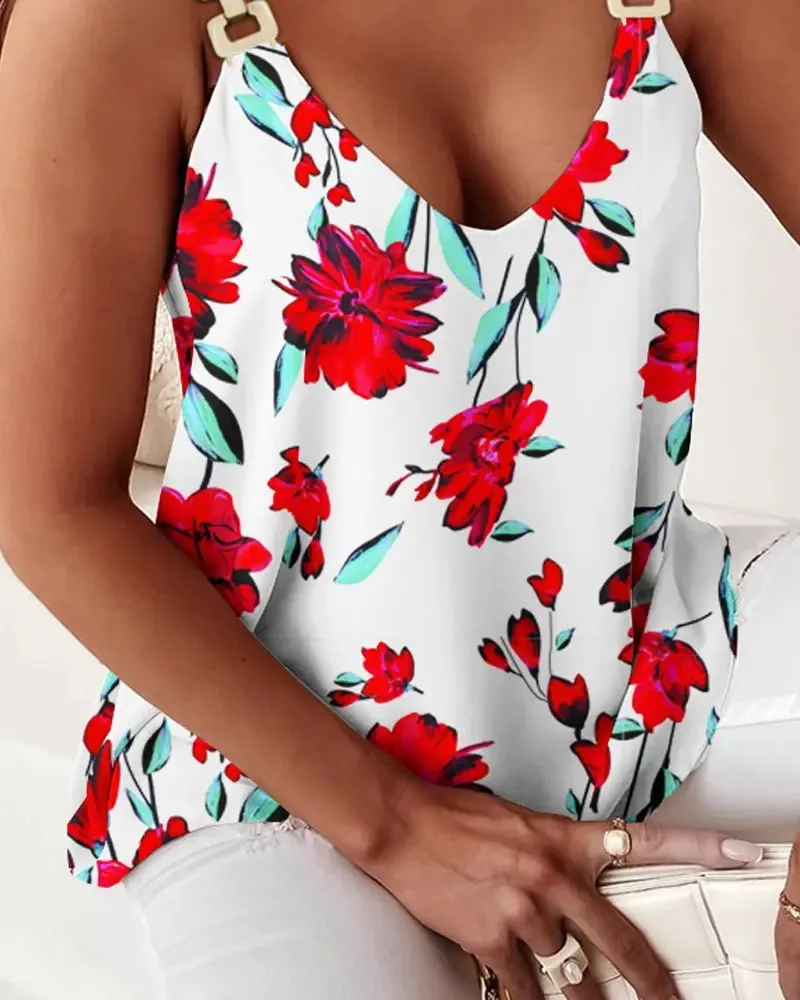 New Fashion Women Casual Floral Print Loose Chain Strap Camis Tank Tops Summer Sleeveless Floral Print Striped Vests Top